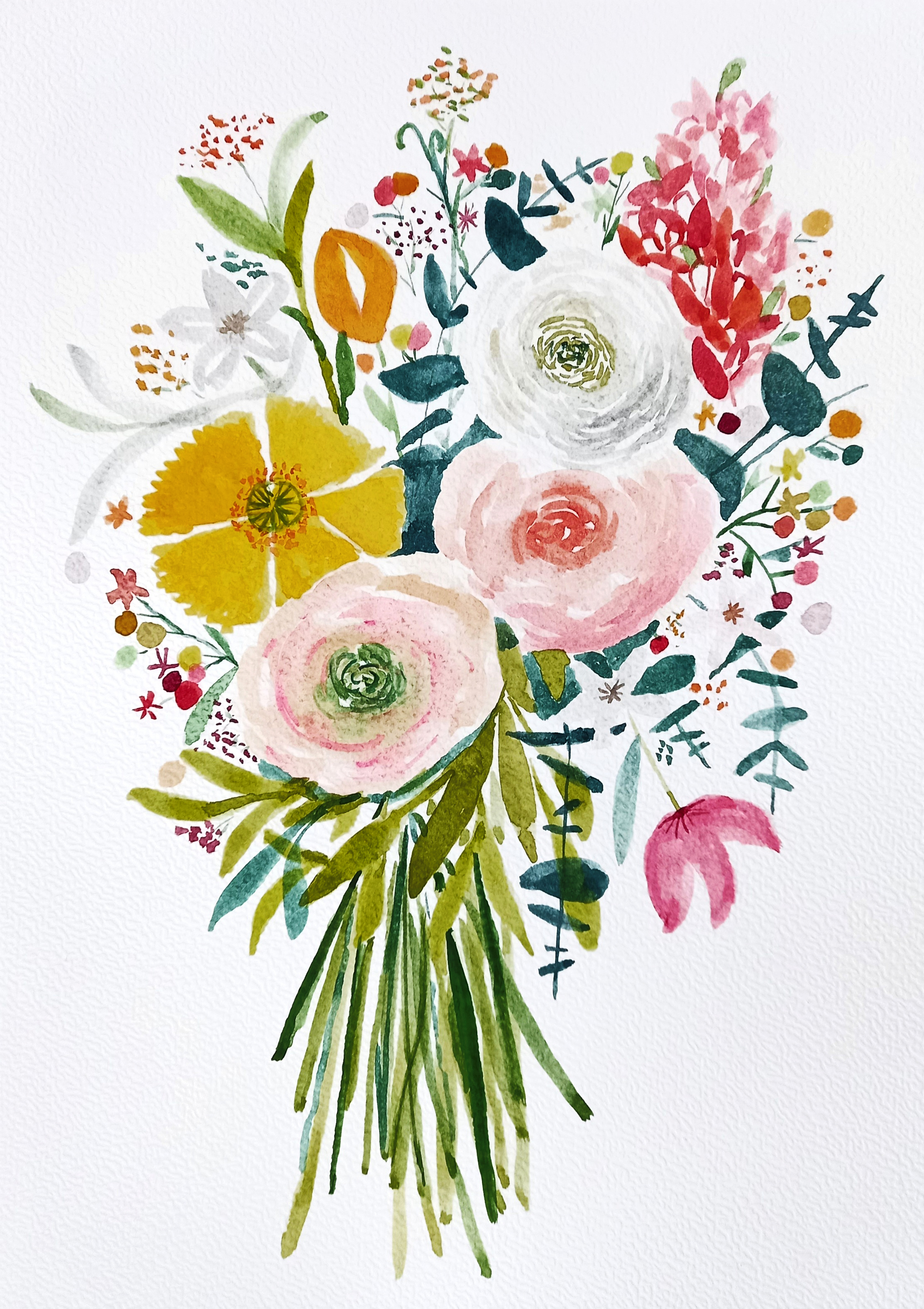 Ce tableau offre un bouquet généreux où se mêlent fleurs éclatantes et feuillages légers. Les couleurs, tantôt douces, tantôt vibrantes, se diffusent avec la transparence propre à l’aquarelle, créant une impression de fraîcheur et de spontanéité. L’ensemble évoque un moment suspendu, comme un bouquet fraîchement cueilli qui rayonne encore de la lumière du jour.