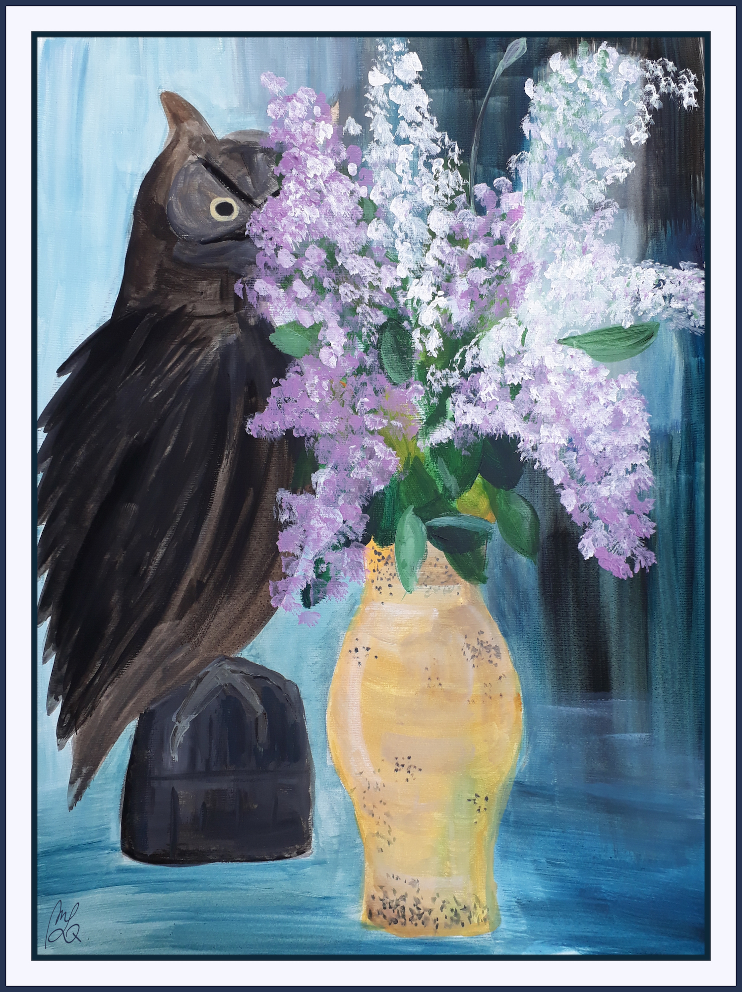 Un gros œil rond accroche le regard dès le premier abord. Les couleurs sombres et les lignes décidées de la chouette contrastent avec la douceur aérienne du bouquet de lilas, tout en tons de blanc et de mauve. L'animal est-il empaillé ou vivant ? Est-il mécontent d'être dissimulé par la gerbe de fleurs, ou s'est-il lancé dans une malicieuse partie de cache-cache ?