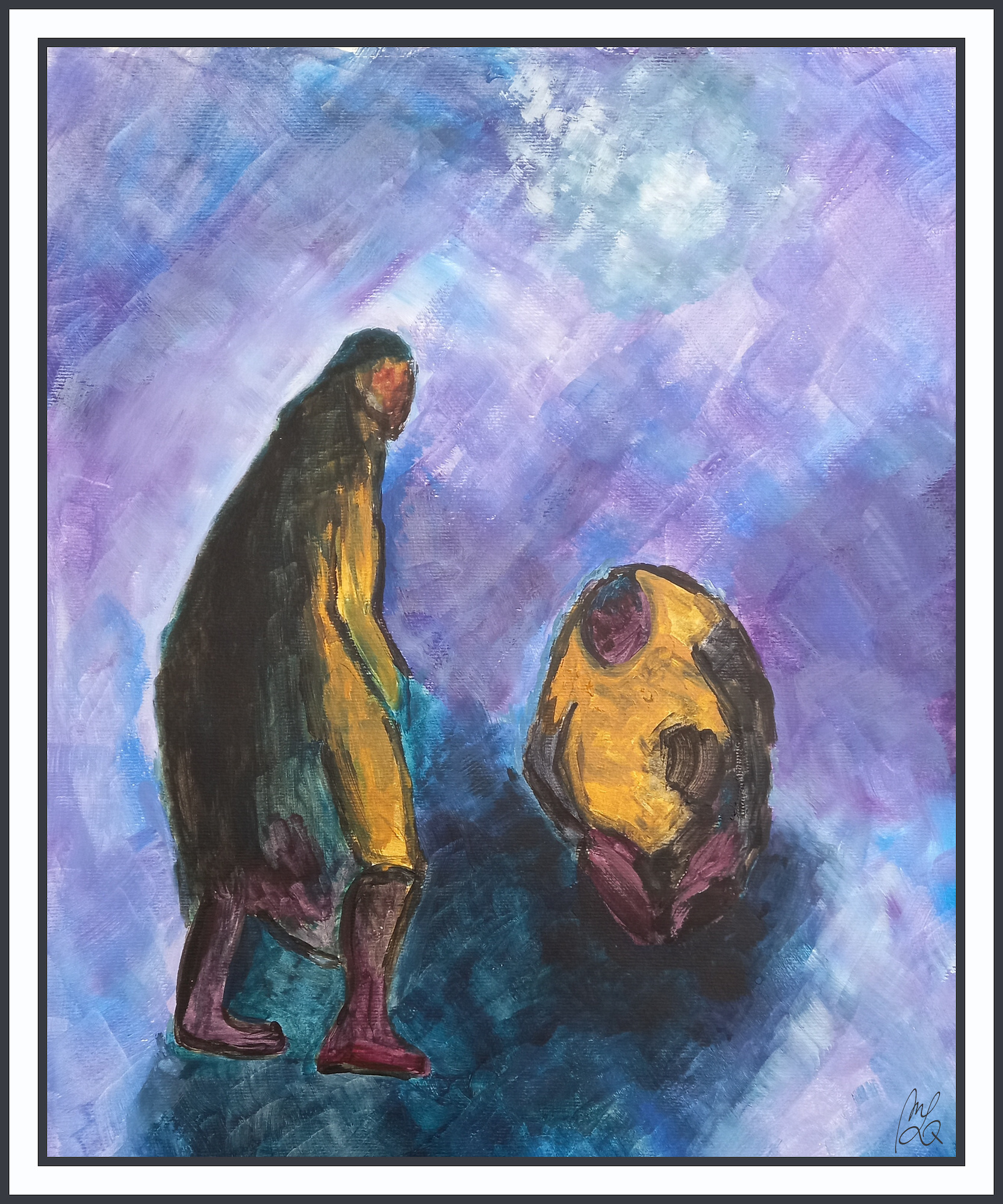 Dans une atmosphère irréelle et délavée où dominent les teintes indigo, deux personnages sont vêtus de jaune et chaussés de rouge. L'un est assis par terre, rompu de fatigue, la tête baissée, le dos courbé – l'espoir semble l'avoir déserté. L'autre se tient debout : malgré son propre épuisement, il trouve encore la force d'apporter du réconfort à son semblable en détresse.