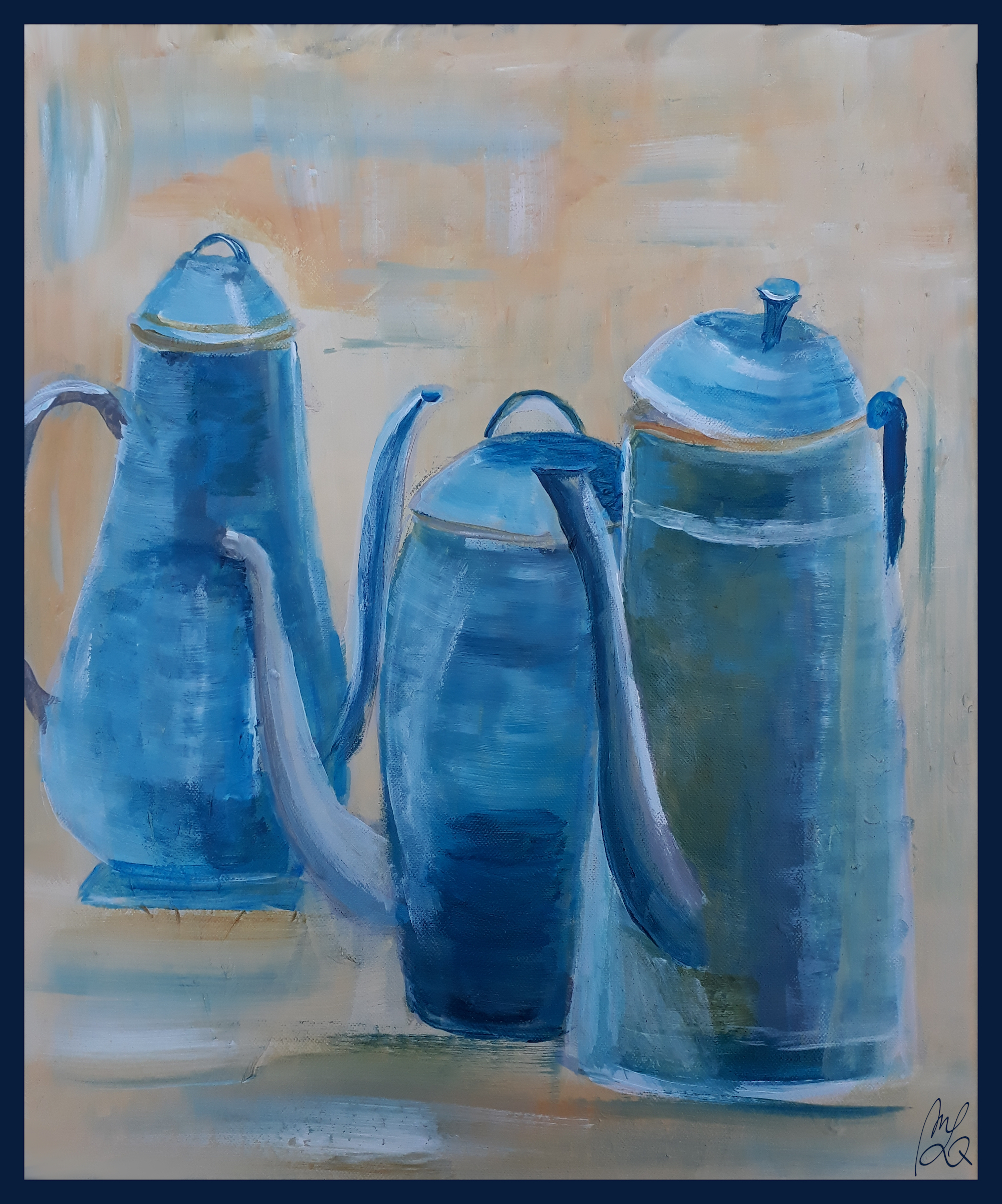 Trois vieilles cafetières d'un bleu profond attendent leur tour d'entrer en scène. Le repas a été plantureux, les convives sont rassasiés et commencent à s'assoupir.