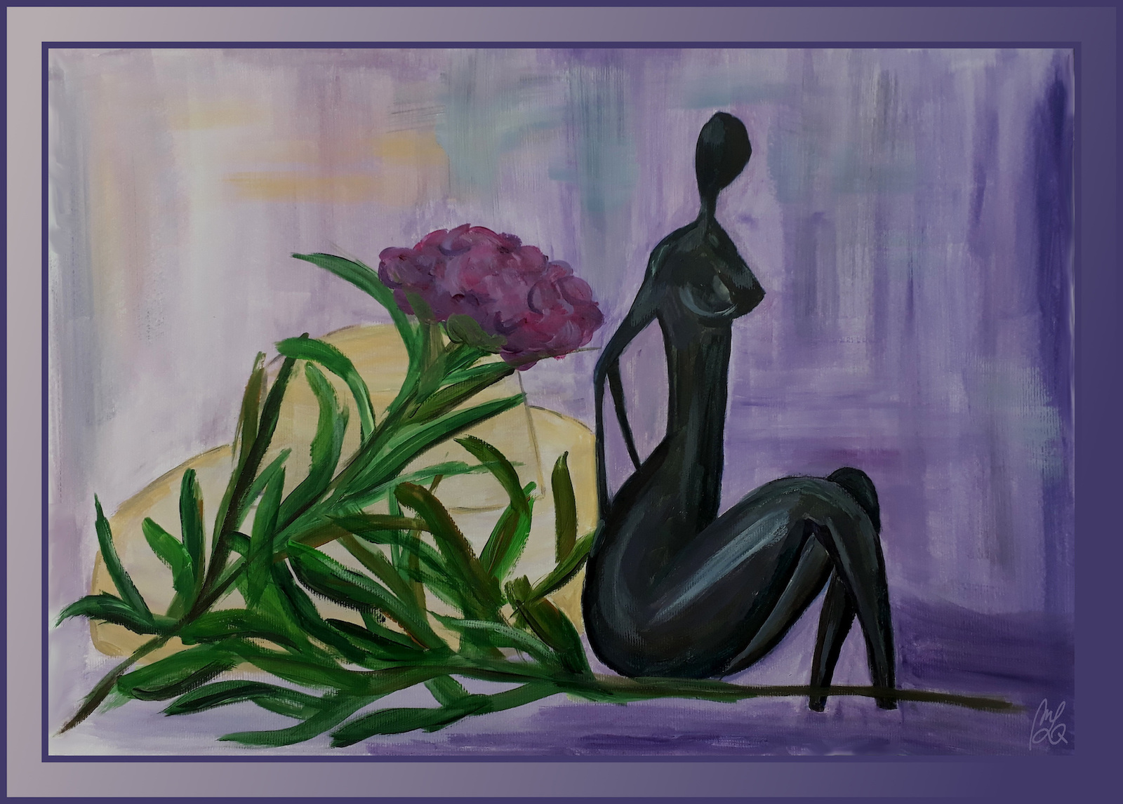 Une statuette d'ébène ou de grenadille, assise, semble rêver d'un autre monde. Adossée à un canotier clair qui évoque le voyage et les escapades estivales sur l'eau, la silhouette féminine se mêle au feuillage nonchalamment déposé au premier plan, dont la fleur semble délicatement posée sur le chapeau.
