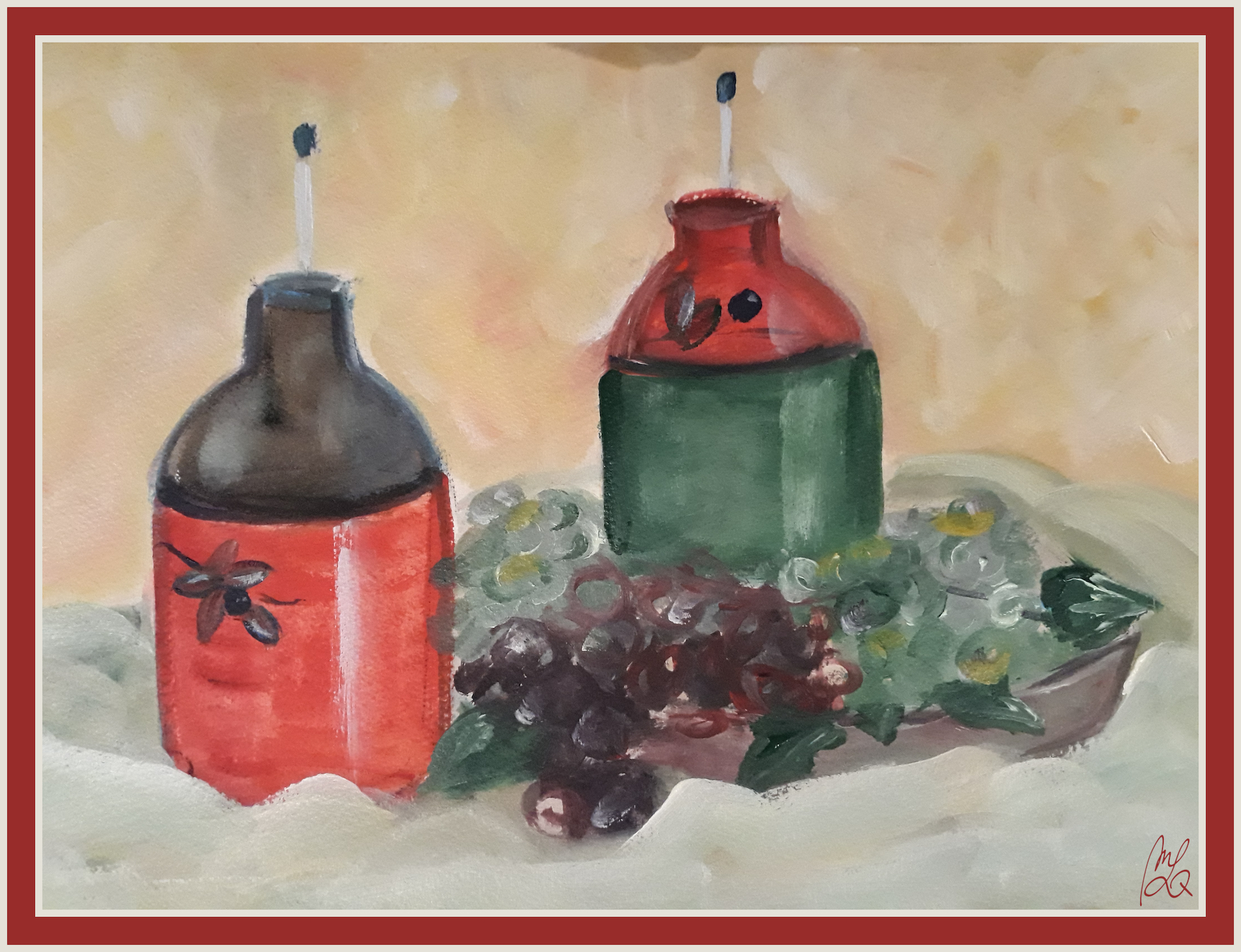 Deux élégantes bouteilles d'huile d'olive encadrent une assiette de raisins. La douceur du blanc crémeux de la nappe fait écho à la blondeur du mur en arrière-plan. Le dîner se prépare, les convives s'installent à table ; c'est l'heure de prendre le temps de déguster les délices de la Méditerranée.