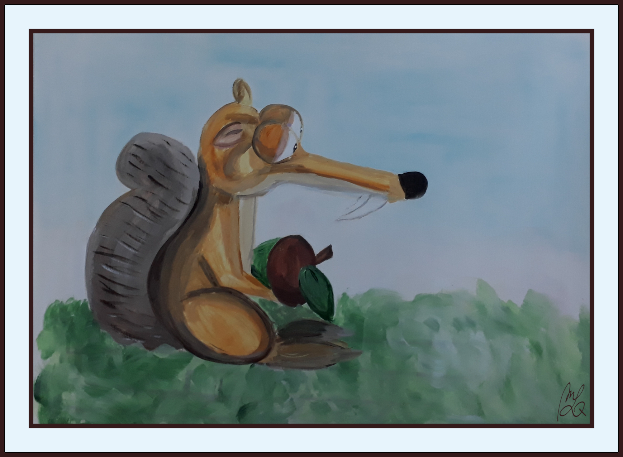 Le célèbre personnage comique de l'Âge de glace tient ici son inséparable noisette d'un air un peu mélancolique. Plongé dans ses pensées, il réfléchit certainement au meilleur endroit où tenter de cacher son trésor à l'abri des convoitises – ou se repose simplement un instant après une de ses rocambolesques aventures.