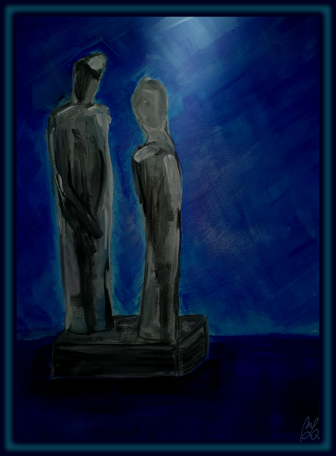 Un éclat de lumière dans le bleu des nuits. Deux silhouettes pétrifiées dans l’attente ou l’espoir. Est-ce un piédestal sur la terre, ou une barque sur la mer ? Le travail du pinceau crée les matières dans ce tableau des possibles où la jouissance des coloris profonds l’emporte sur le sens du trait.